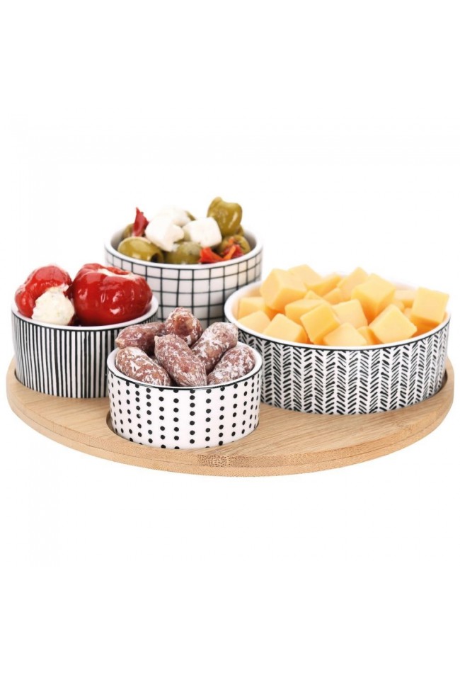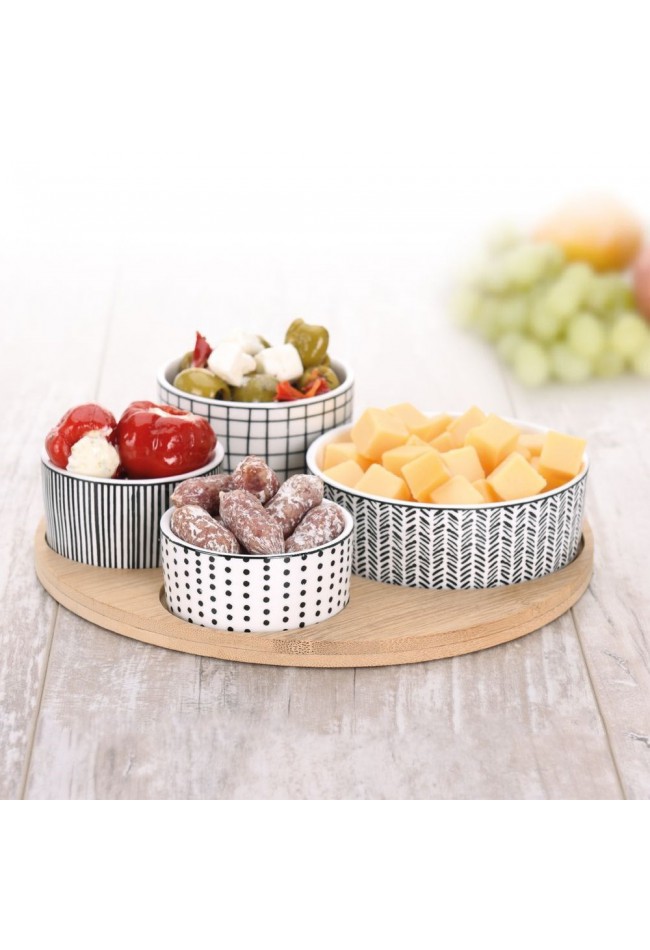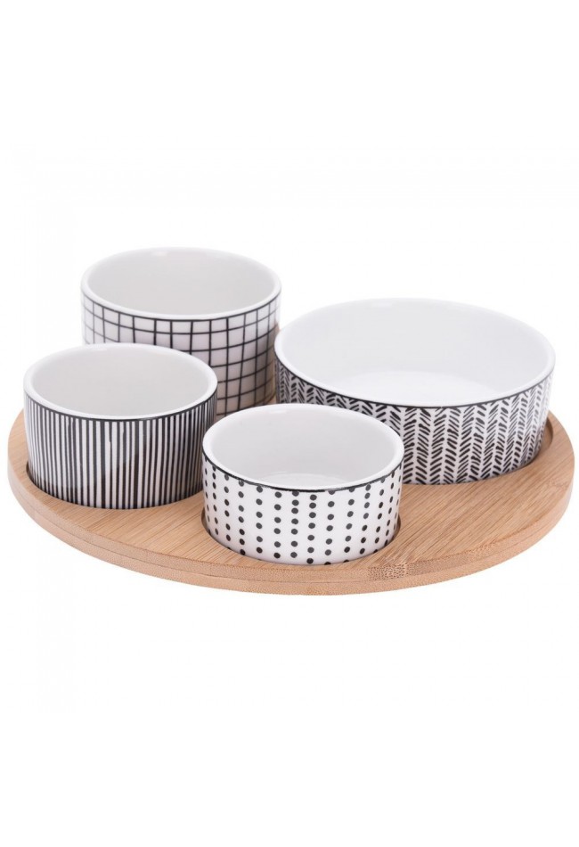EH keturių dekoruotų porcelianinių dubenėlių rinkinys su bambuko medienos padėklu.